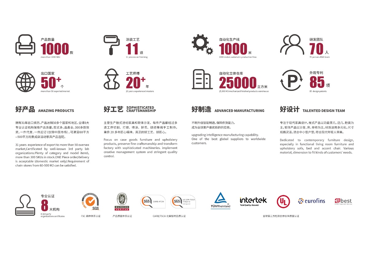 專注于客餐廳、臥室家居產(chǎn)品的研究、開發(fā)、生產(chǎn)和銷售。自1989年創(chuàng)立以來,歷經(jīng)了兩代人30年的發(fā)展,我們忠于初心,專注在客餐廳及臥室家居產(chǎn)品,業(yè)務(wù)已遍布世界各大洲。